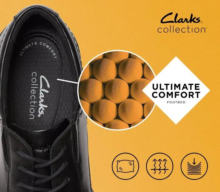 A minimalist silhouette with refined details, our Dresslite Ace dress shoe features a lightweight EVA outsole and foam-lined inside to surround the foot in ultimate comfort – from navigating the boardroom to bringing a polished touch to weekend looks. Defined by a premium leather upper with burnished detailing, it features an authentic lace and heritage stitching to enhance its crafted aesthetic for a look that’s undeniably Clarks.