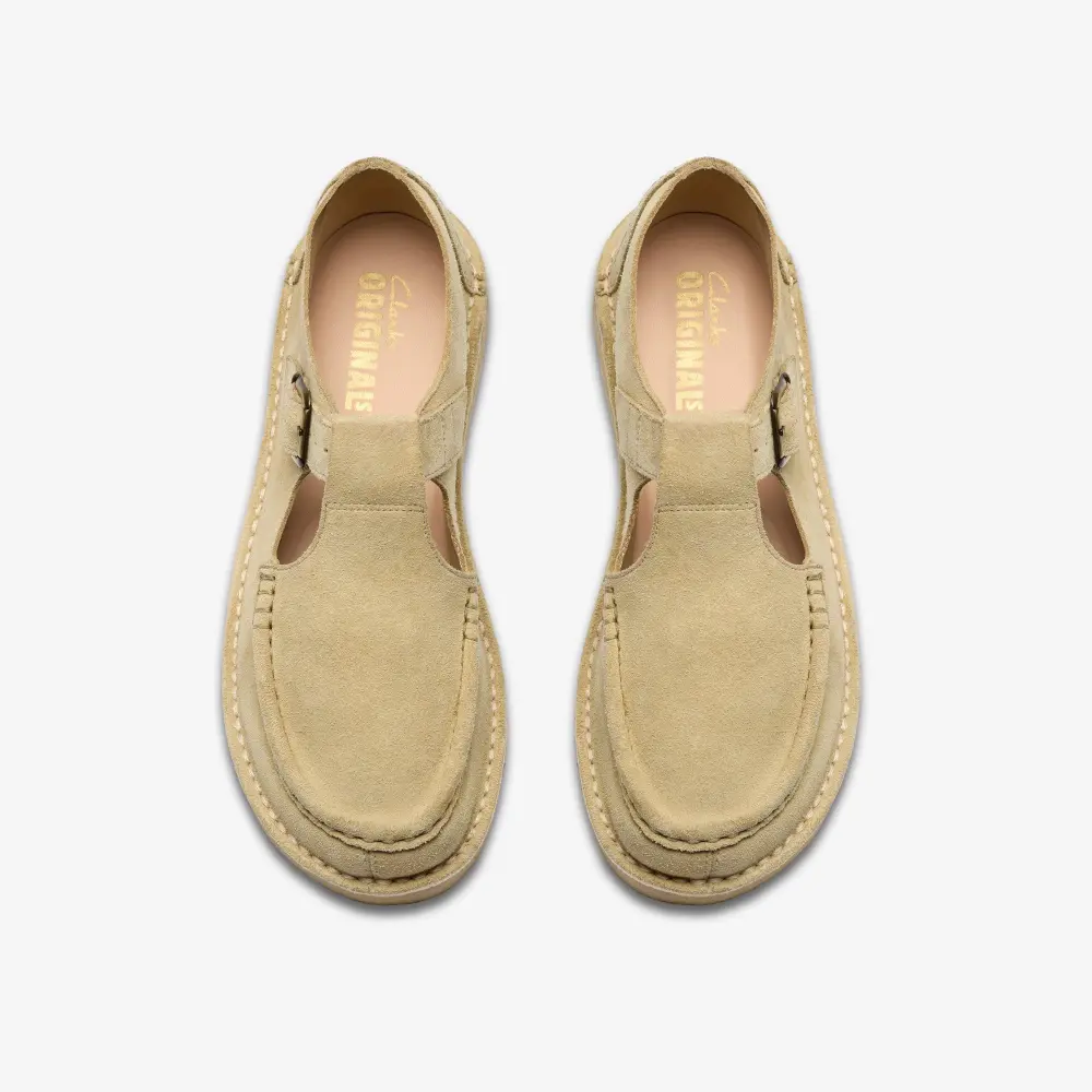 Crafted with suede uppers and a secure buckle fastening, the Nomad T Bar combines functionality with refined details. The hand-stitched apron seam adds a touch of craftsmanship, while the Clarks Originals heat-embossed metallic logo on the sock and the iconic camel Trek Man embossed on the heel counter showcase the shoe’s heritage.