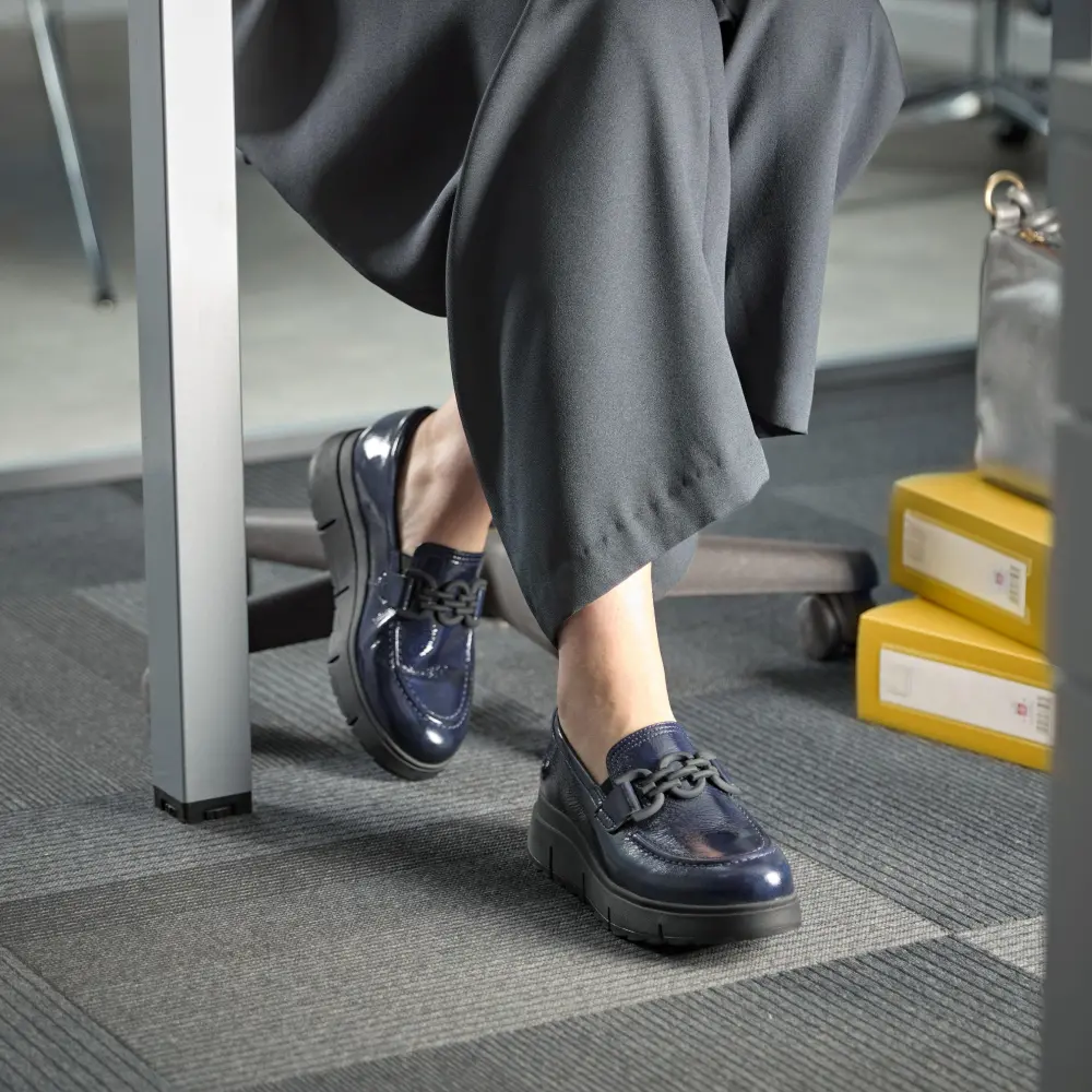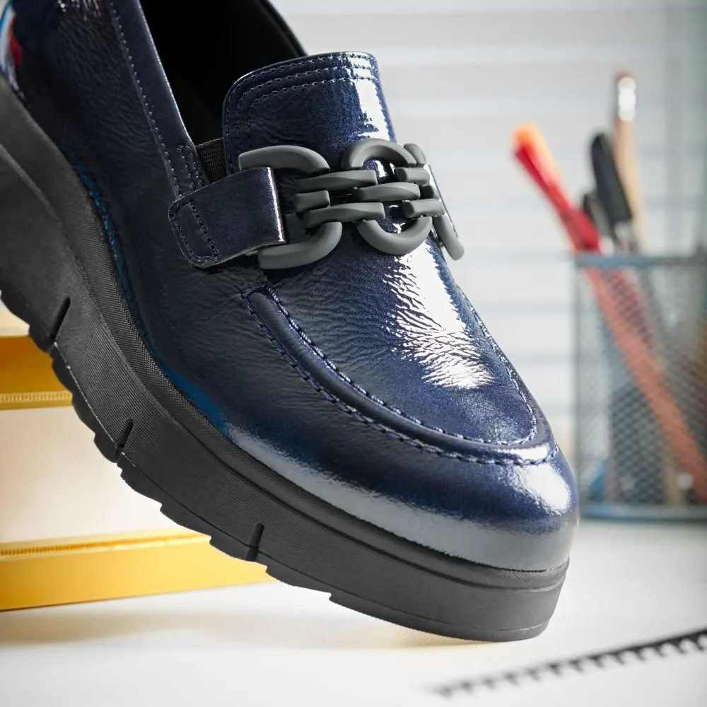 - Premium navy patent leather upper